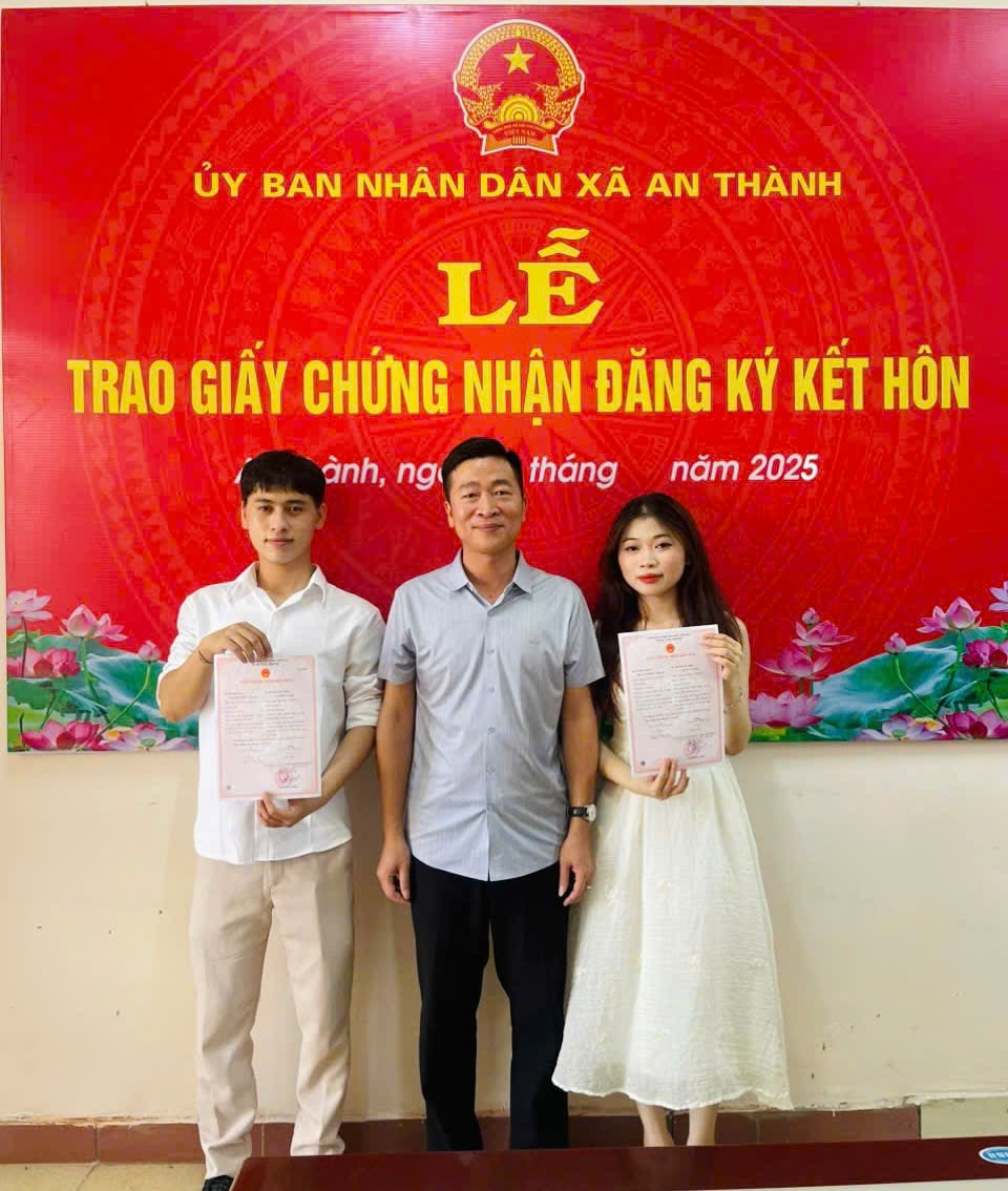 Sáng ngày 05/11/2025, Ủy ban nhân dân xã An Thành tổ chức lễ trao Giấy chứng nhận kết hôn cho 02 đôi bạn trẻ .Buổi lễ diễn ra trong không khí ấm áp, trang trọng và tràn đầy niềm vui.